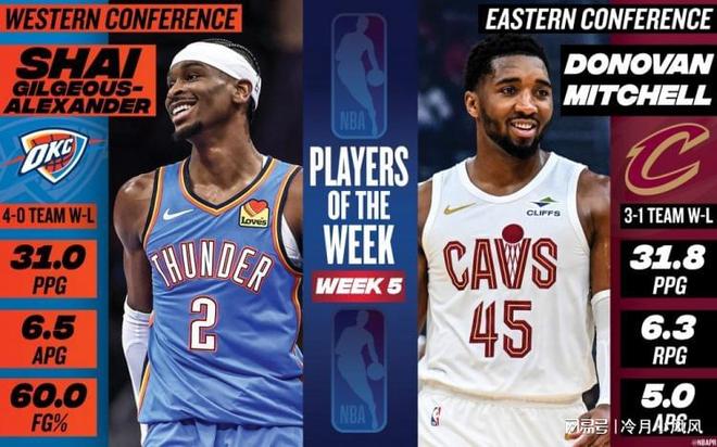 今日,NBA官方公布了第五周周最佳球员名单,结果显示,东部属于骑士后卫米切尔,西部则由雷霆核心亚历山大当选。上周,米切尔出战4场,场均可以轰下31.8分6.3篮板5助攻,帮助骑士取得了3胜1负的不俗战绩;亚历山大打了4场,场均贡献31分6.5助攻,投篮命中率高达60%,率领雷霆四战全胜。值得一提的是,在周最佳提名榜单中,上周球队战绩仅1胜3负的快船球星詹姆斯哈登出人意料的入选。