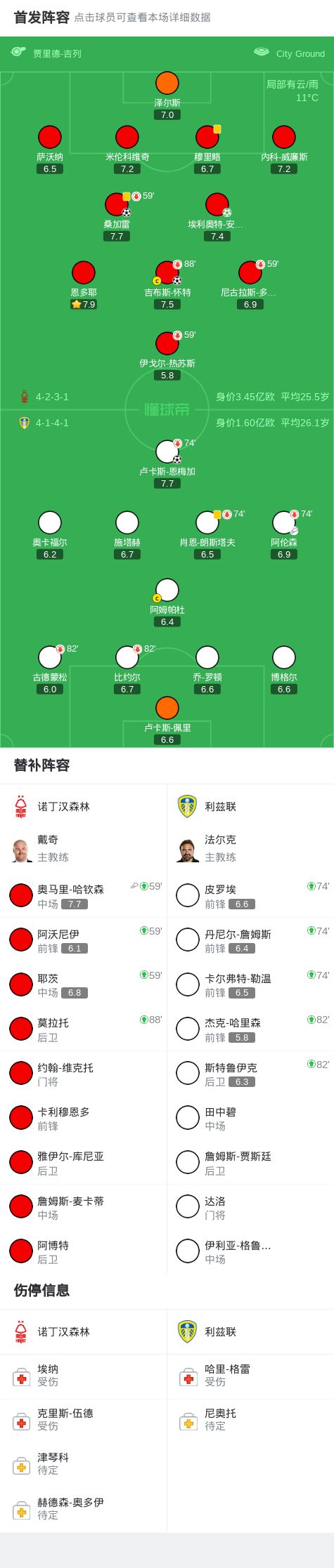 第68分钟,反超比分,吉布斯-怀特将球蹭进球门,诺丁汉森林2-1