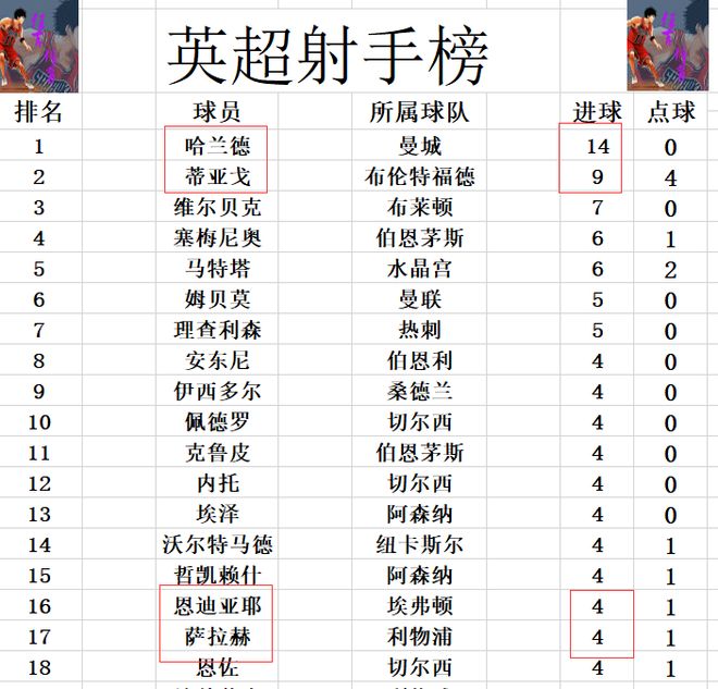 射手榜方面,前十没有变化,哈兰德14球领跑,蒂亚戈9球排在第2,维尔贝克7球排在第3,塞梅尼奥和马特塔6球并列第4。恩迪亚耶今天未能进球,还是和萨拉赫,恩佐,埃泽,哲凯赖什等人4球刚好挤入前十。