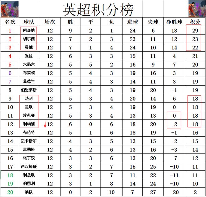 积分榜方面,阿森纳6分优势力压切尔西稳居榜首,曼城差切尔西1分排在第3,维拉,水晶宫依次1分只差排在第4,第5。曼联今天无力赢球错失冲进前4的大好机会,输球的他们被埃弗顿追上,加上热刺,利物浦,四队同积18分,利物浦净胜球劣势已经跌出上半区,曼联排在第10。